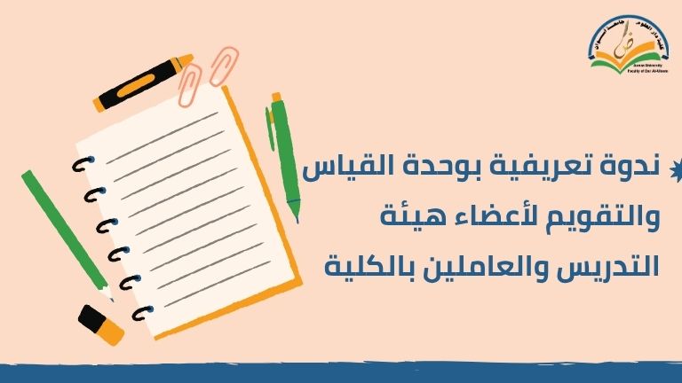 تعلن وحدة القياس والتقويم بكلية دار العلوم جامعة أسوان عن عقد ندوة تعريفية لأعضاء هيئة التدريس والهيئة المعاونة والعاملين بالكلية، بعنوان: وحدة القياس والتقويم ” الرؤية والرسالة والأهداف”، وكذلك لتشكيل لجان الوحدة وتوزيع المهام ، وذلك يوم الأحد الموافق 12/10/2025م.
