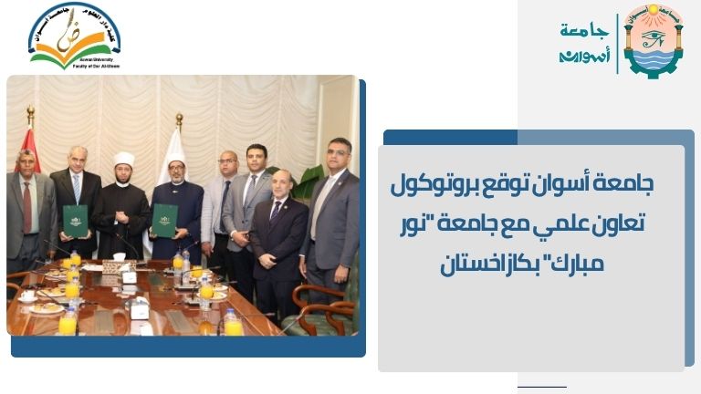 The protocol was signed by Professor Dr. Loai Saad El-Din Nusrat, President of Aswan University, and Professor Dr. Ahmed Hussein Mohamed, President of Nur Mubarak University. It was decided to appoint Professor Dr. Mohamed Abu El-Sheikh, Dean of the Faculty of Dar Al-Uloom at Aswan University, as the coordinator of academic cooperation, and his counterpart at Nur Mubarak University, Professor Dr. Mohamed El-Wardani, Dean of the Faculty of Islamic Studies.