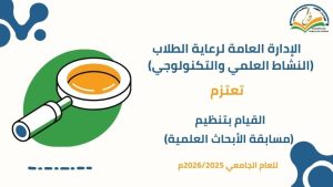 تعتزم الإدارة العامة لرعاية الطلاب (النشاط العلمي والتكنولوجي) القيام بتنظيم (مسابقة الأبحاث العلمية) للعام الجامعي...