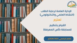 تعتزم الإدارة العامة لرعاية الطلاب (النشاط العلمي والتكنولوجي) القيام بتنظيم (مسابقة كأس المعرفة) للعام الجامعي...