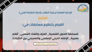 تعتزم الإدارة العامة لرعاية الطلاب (إدارة النشاط الفني) القيام بتنظيم مسابقات في (مسابقة الفنون الشعبية...
