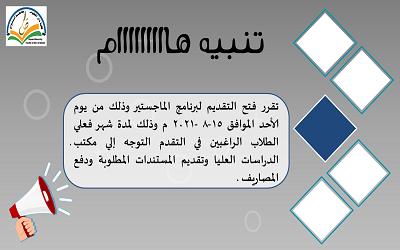 تقرر فتح التقديم لبرنامج الماجستير وذلك من يوم الأحد الموافق 15-8 -2021 م وذلك لمدة شهر فعلي الطلاب الراغبين في التقدم التوجه إلي مكتب الدراسات العليا وتقديم المستندات المطلوبة ودفع المصاريف وللإطلاع علي الأوراق المطلوبة الرجاء الدخول إلي الرابط الآتي :.