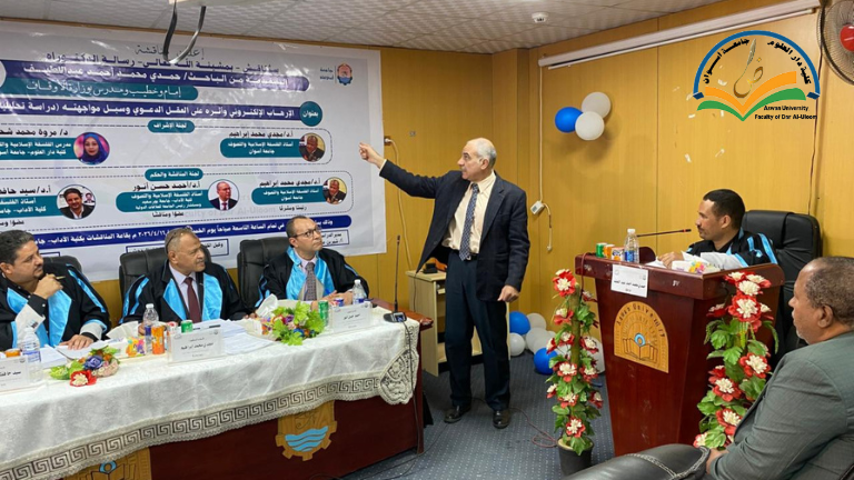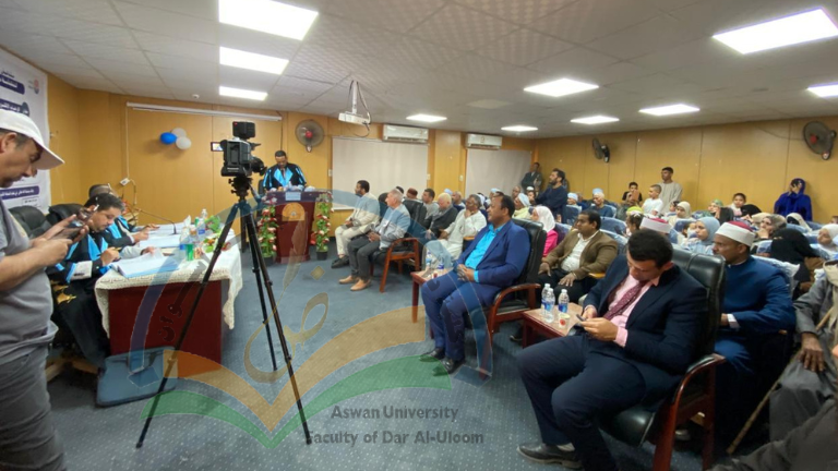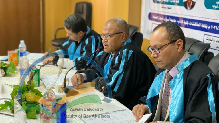 وقد شهدت المناقشة حضور الأستاذ الدكتور/ لؤي سعد الدين نصرت_ رئيس جامعة أسوان، والأستاذ الدكتور/ عبد الحفيظ مصطفى عبد الهادي_ عميد كلية دار العلوم، إلى جانب عدد من أعضاء هيئة التدريس والباحثين والمهتمين.