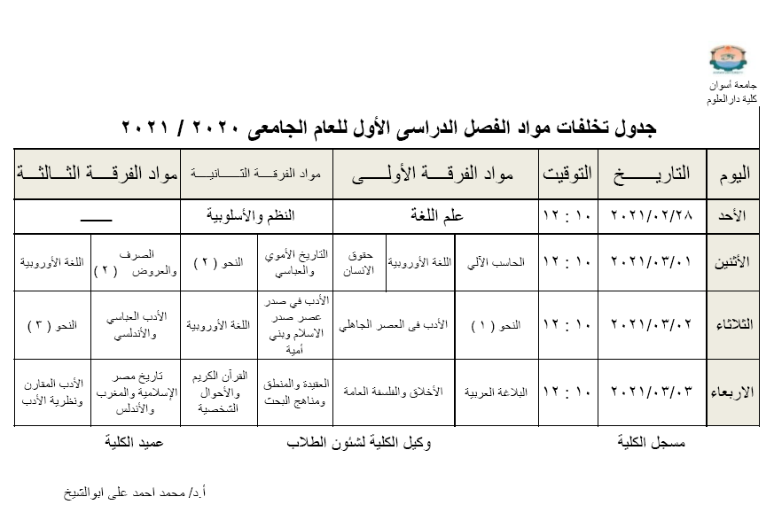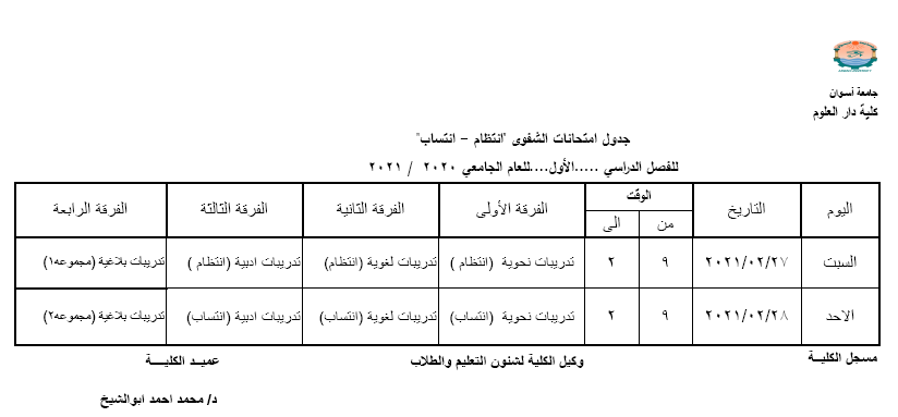 جدول امتحان الشفوي والتخلفات لجميع الفرق للفصل الدراسي الأول للعام الجامعي 2020-2021 February 18, 2021February 18, 2021 OmniaUncategorized اقرأ المزيد