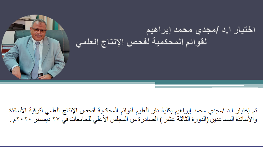 اختيار ا.د /مجدي محمد إبراهيم لقوائم المحكمية لفحص الإنتاج العلمي