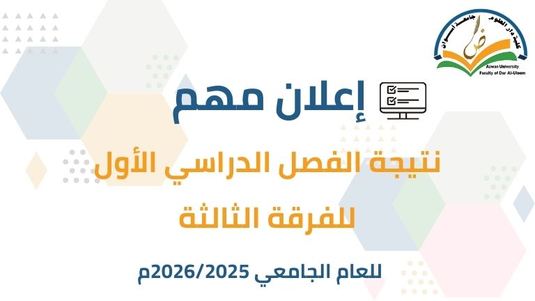 اعتمد الأستاذ الدكتور/ عبدالحفيظ مصطفى عبدالهادي_ عميد كلية دار العلوم جامعة أسوان، نتيجة الفصل الدراسي الأول للفرقة الثالثة (انتظام- انتساب) للعام الجامعي 2026/2025م.