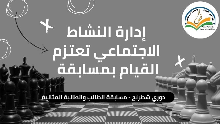 تعلن الإدارة العامة لرعاية الشباب المركزية ( إدارة النشاط الاجتماعي والرحلات) عن القيام بتصفيات لطلاب كليات الجامعة وذلك في مسابقة (دوري الشطرنج_ مسابقة الطالب والطالبة المثالية)، تمهيدًا للمشاركة القمية على مستوى الجامعات المصرية، علمًا أن المسابقة سوف تقام يوم الأربعاء الموافق 2025/12/17م بكلية التربية الساعة السادسة مساءً.