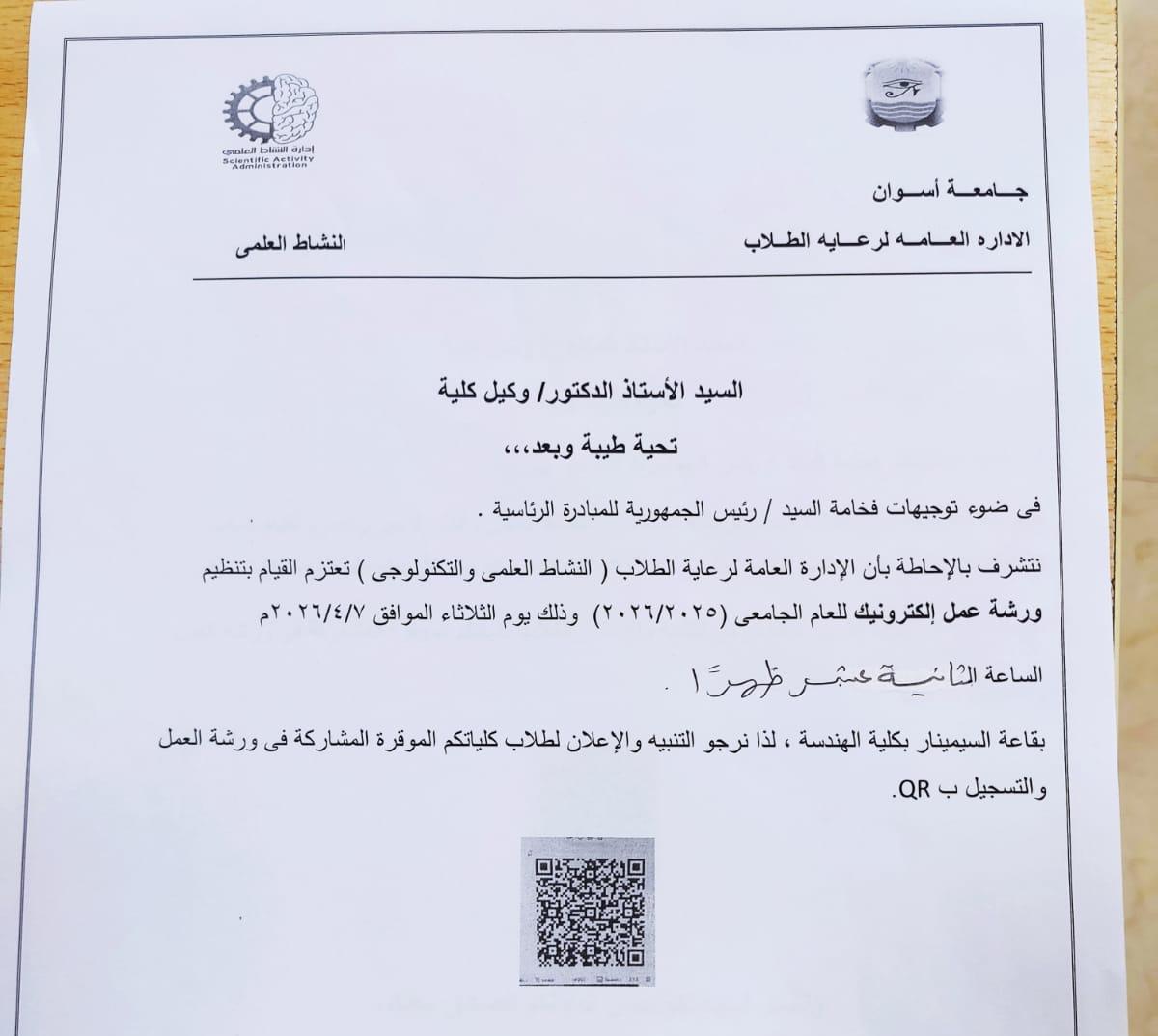 – ورشة عمل الكترونيك وذلك يوم الثلاثاء الموافق 2026/4/7 الساعة الثانية عشر ظهرًا بقاعة السيمنار بكلية الهندسة، للمشاركة في ورشة العمل من خلال الQR…. من هنا.