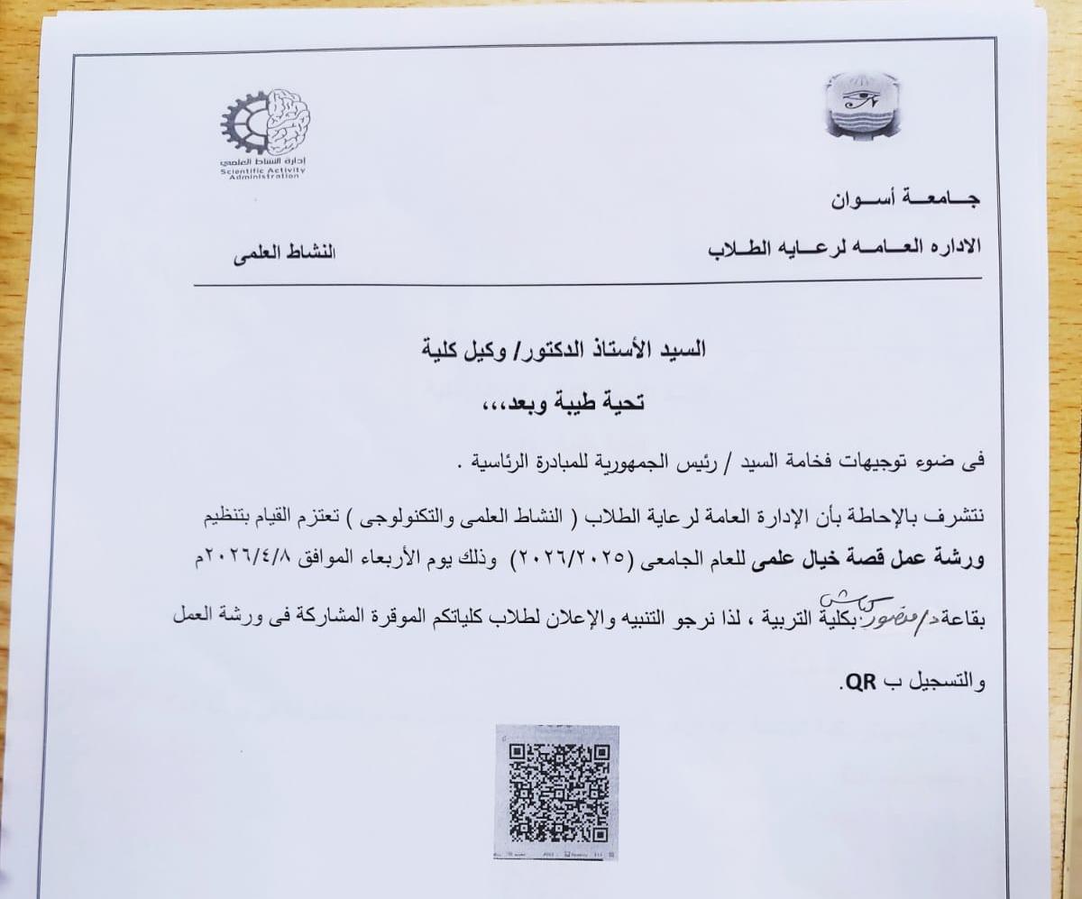 – ورشة عمل قصة خيال علمي وذلك يوم الأربعاء الموافق 2026/4/8، بقاعة د. منصور كباش بكلية التربية، للمشاركة في ورشة العمل من خلال الQR…. من هنا.