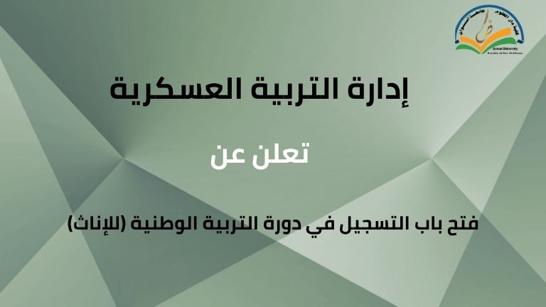 تعلن إدارة التربية العسكرية عن فتح باب التسجيل في دورة التربية الوطنية (للإناث) رقم (7)، والمقرّر عقدها في الفترة من 2025/12/6م حتى 2025/12/18م بكلية الهندسة – أبو الريش. علمًا أن التسجيل سيكون أونلاين فقط.